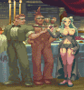 Captain Commando, Ginzu and Carol from Captain Commando (More) | The Captain and Ginzu appear in the center of the stage, the former presenting a flower bouquet to Eliza. The Captain wears a full black tuxedo marked with his armor's star logo, while Ginzu sports his regular ninja uniform. Behind them stands Carol, one of the games' generic enemies, holding two trays in her hands, one with wine and the other with a roasted meat with a bone. She also appears to sport bunny ears. This character has often been mistakenly identified as Michelle Heart from Legendary Wings, but All About Street Fighter Zero 2 explicity identifies her as the Captain Commando enemy. |