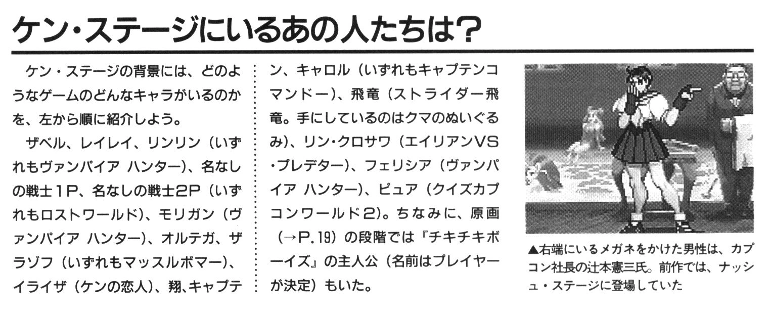 This page summarizes the character cameo appearances in Ken's stage from Street Fighter Alpha 2. This also includes a character from the Capcom-licensed Alien vs. Predator Arcade game.