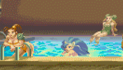 | Felicia from Darkstalkers | She's seen inside the pool, fully submerged so only her head and shoulder can be seen. Her blue hair and white cat ears makes her completely recognizable, however. She's not featured in the original concept art, instead the two main characters from Mega Twins (Chiki Chiki Boys in Japan) can be seen swimming in her place inside the pool. | |