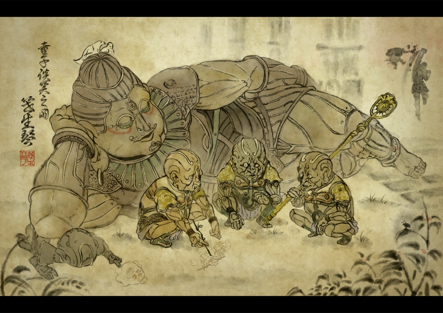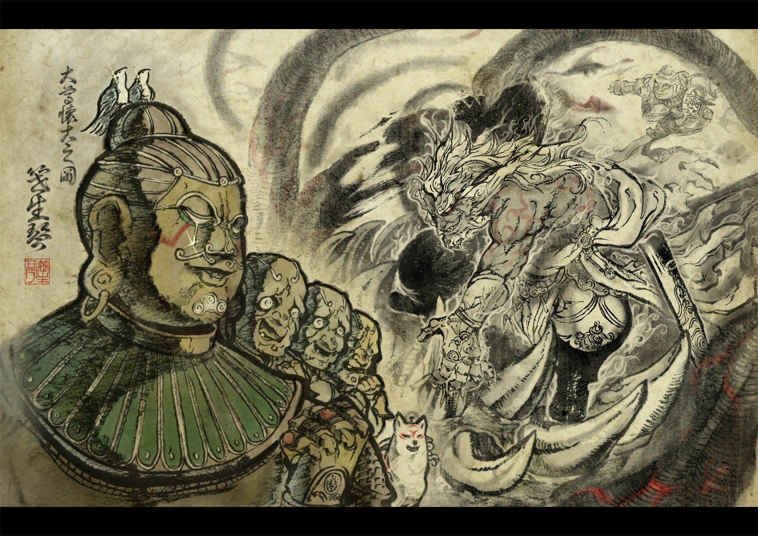 Amaterasu and Issun from Ōkami | Scroll the image to the lower-mid area to see Amaterasu and Issun standing next to the grinning soldier and the three zombie-like enemies. |