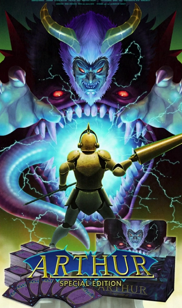 There's an easter egg poster inspired by Ghosts 'n Goblins found in the remake of Resident Evil 3: Nemesis. One of the many posters located in the walls of the subway area is an ad for a trading card game titled "Arthur: Special Edition". The artwork depics Arthur, his back facing the viewer, wielding his Golden Armor (first introduced in Ghouls 'n Ghosts) and holding a lance (his most iconic weapon) while facing his arch-nemesis the Demon King Astaroth. At the bottom one can see a display box and several stacks of cards.