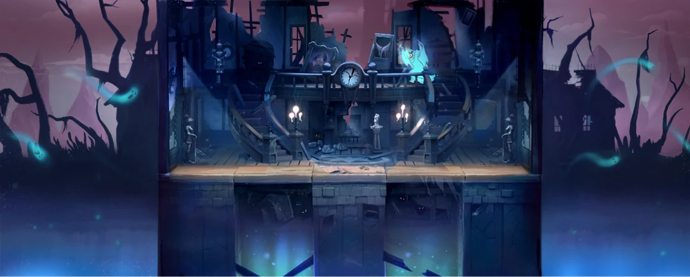 Scooby's Haunted Mansion is a Map in MultiVersus, based on a generic Haunted Mansion from the Scooby-Doo Universe. The map consists of a single large body divided into five equal sections, as well as a large wall on either side of the stage. These walls can be destroyed with enough damage. A pit is located on the other side of both walls. The mansion's roof has a hole above the Map's middle section from where Fighters can get rang out. If the levers near the walls are attacked, the second and fourth sections of the floor will drop out, creating bottomless pits that can kill Fighters who fall in.
