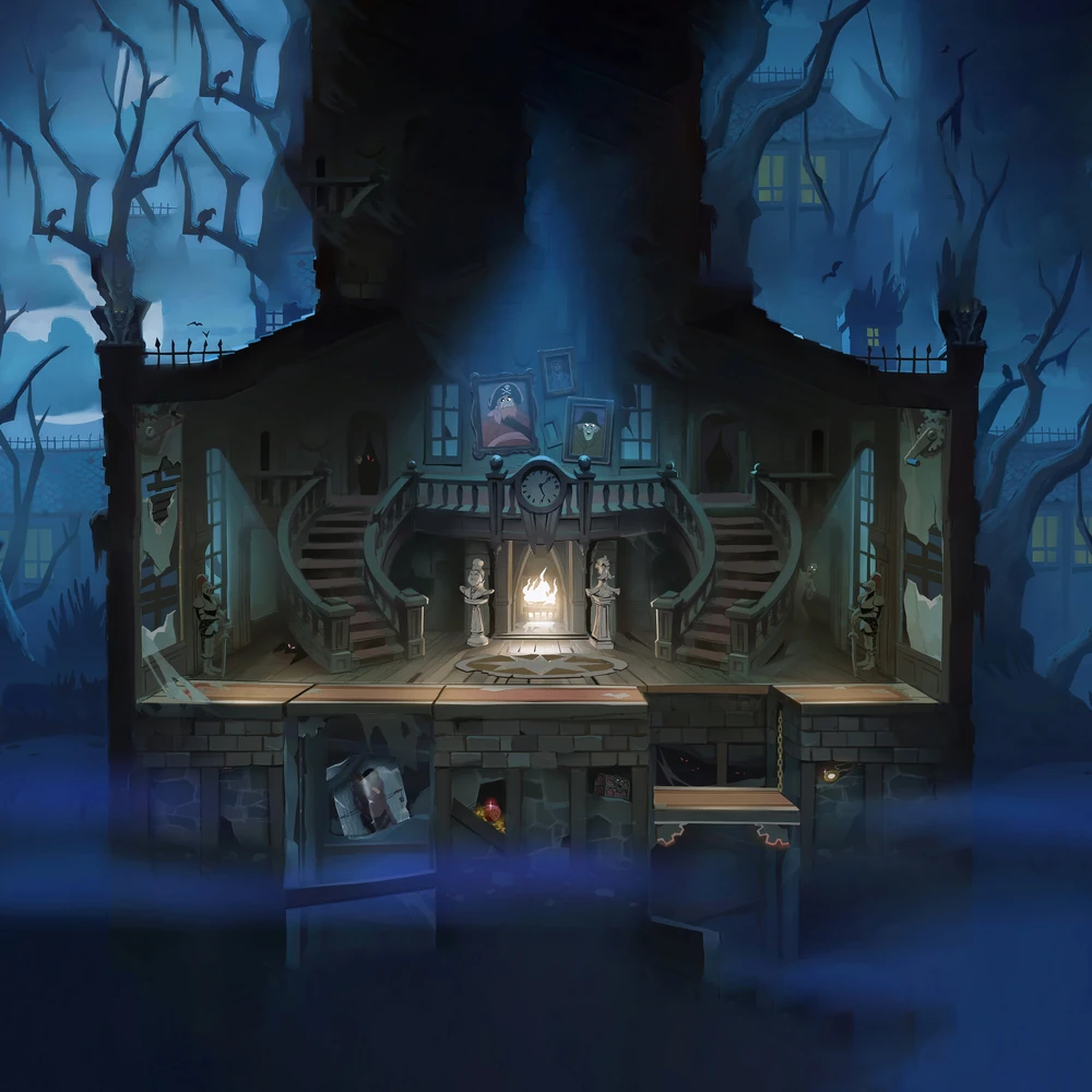 This Map also contain multiple references to classic Scooby-Doo villains, those being one of the Green Ghosts who appears in the background of the Maps, the Caveman who appears frozen in ice in one of the pits, and portraits depicting the Ghosts of Redbeard and Mr. Hyde, as well as the original incarnation of Captain Cutler. There are also two knight armors sitting near the walls (the No Roof variation also has two more in the background) which serve as a nod to the Black Knight. The Chest of Demons from The 13 Ghosts of Scooby-Doo can also be seen buried under the mansion. Two statues can also be seen in the background near the fireplace (one of them is broken in the No Roof variation). These statues will always move their heads and follow one of the Fighters.
