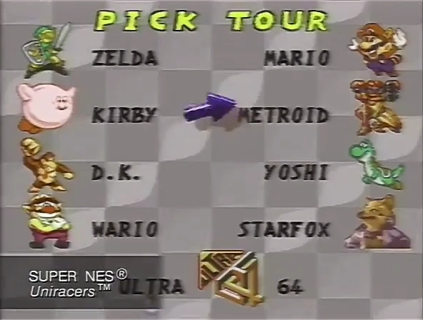 Additionally, the promotional video "Nintendo Power Previews #9" showed a gameplay clip where the names and images of the Tours are based on other Nintendo series. These are specifically: