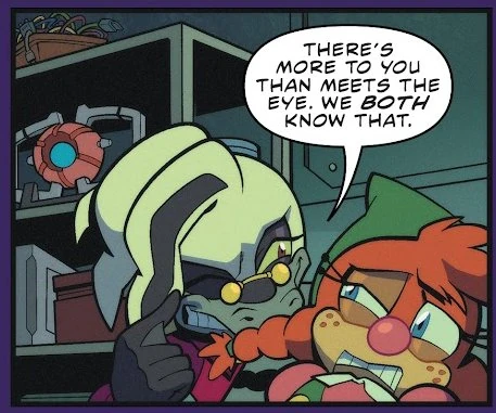 On page six of the comic, Dr. Starline is keeping the robot Belle the Tinkerer strapped to a table to study her, and on a shelf in the background there's what appears to be the Matrix of Leadership from the Transformers series. It can be seen partially covered in the second panel, and it's completely visible in the last panel, where Dr. Starline also says "There's more to you than meets the eye", a reference to the Transformers quote "more than meets the eye".