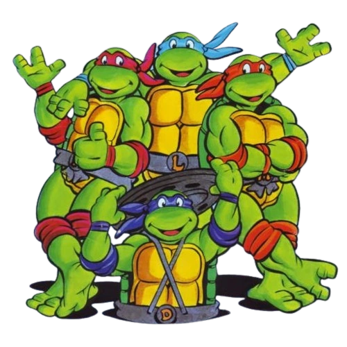 The Teenage Mutant Ninja Turtles; Leonardo (blue), Donatello (purple), Raphael (red), and Michelangelo (orange), the main protagonists in the series, as portrayed in the 1987 animated series.